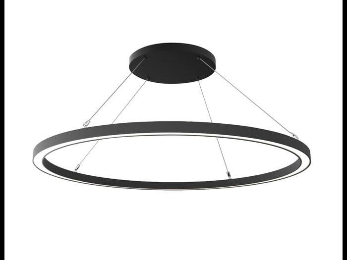 Lux-May PLANET/MOD CIRCLE OPENED LED luminaire, 63W, 7300lm, with opal diffuser for uniform lighting. Includes transparent suspension cable and ceiling base. DALI dimmable option available.