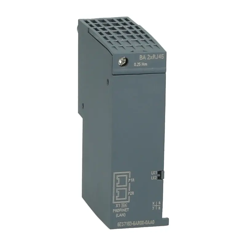 The SIMATIC ET 200SP Busadapter BA 2xRJ45 (6ES7193-6AR00-0AA0) is a compact and reliable communication module for ET 200SP systems. It features two RJ45 ports (switch) for PROFINET IO connectivity, ensuring stable data transfer in industrial automation networks. Ideal for integrating ET 200SP modules into PROFINET networks in manufacturing and process control applications.