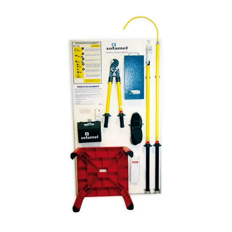 The Sofamel BS-45 Rescue Pole Kit is a complete electrical safety and first-response solution designed for use in medium-voltage substations and industrial facilities. This kit ensures immediate action during electrical accidents, providing the essential tools for rescue, protection, and first aid in environments up to 45 kV. It is supplied with all necessary insulated equipment and accessories to comply with safety standards.