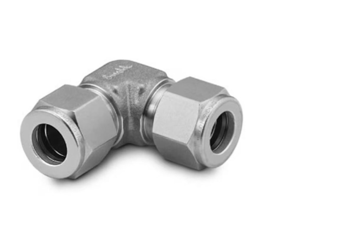 Stainless Steel Swagelok Tube Fitting, Union Elbow, 1/16 in. Tube OD. Constructed from 316 stainless steel, this union elbow fitting features 1/16 in. tube OD connections on both ends. It undergoes standard SC-10 cleaning and packaging and does not include a flow restrictor or bored-through feature.